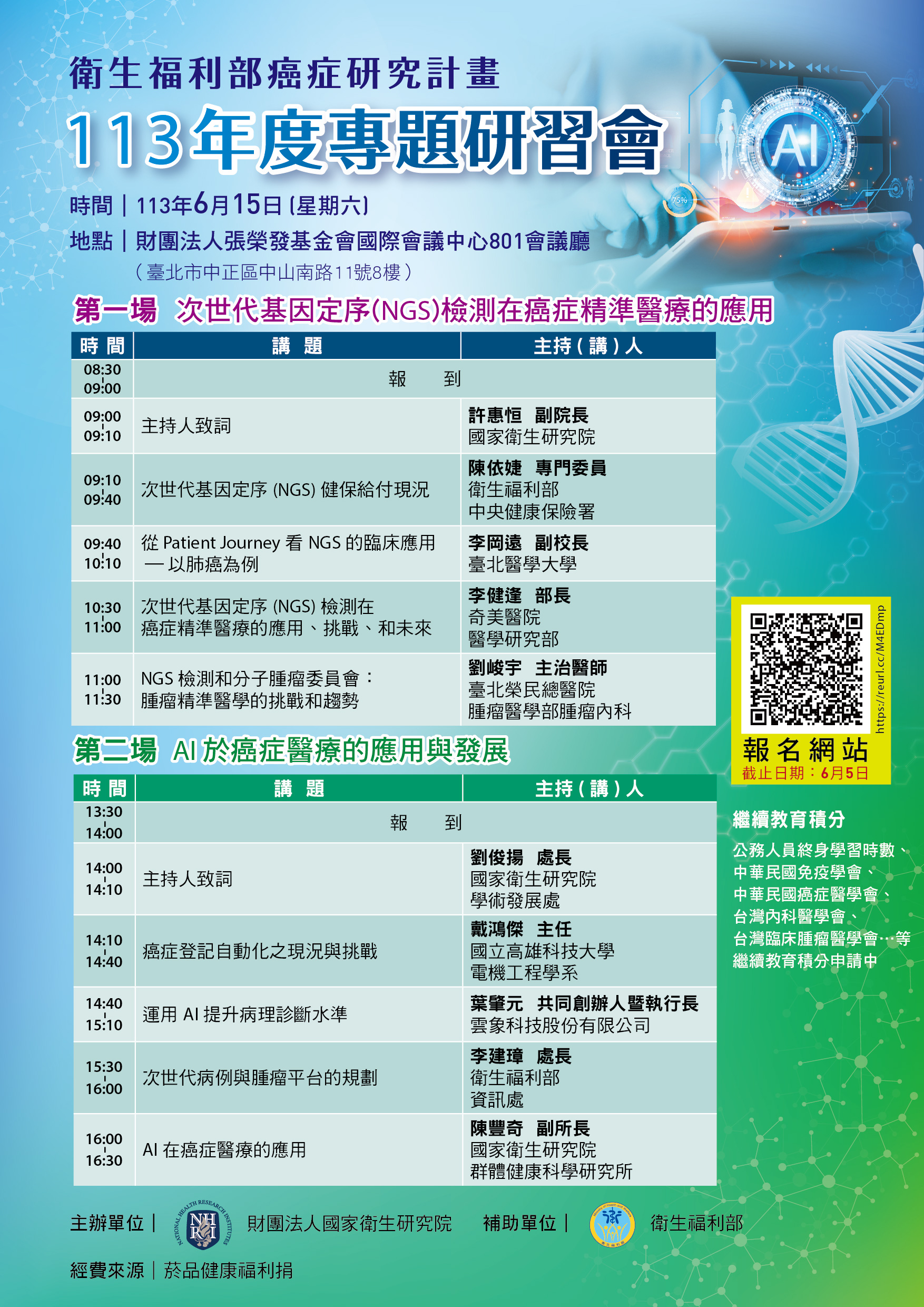 6月15日衛生福利部癌症研究計畫113年度專題研習會,歡迎踴躍報名參加(報名截止:6/5)
